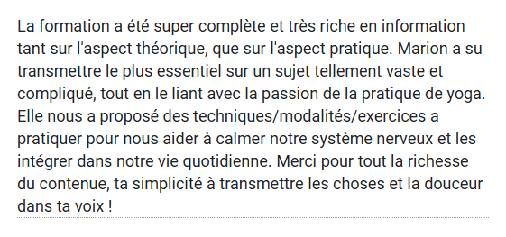 La formation te transmet ce qu'il faut pour intégrer les outils et pratiques dans tes cours et créer/adapter tes séances seulement si tu es enseignant.e de yoga ou d'une pratique corporelle avec une formation initiale. Si tu es thérapeute (ou autre), tu pourras transmettre les outils de façon individuelle à tes clients ou patients (exercices, enchainement de 2/3 mouvements).